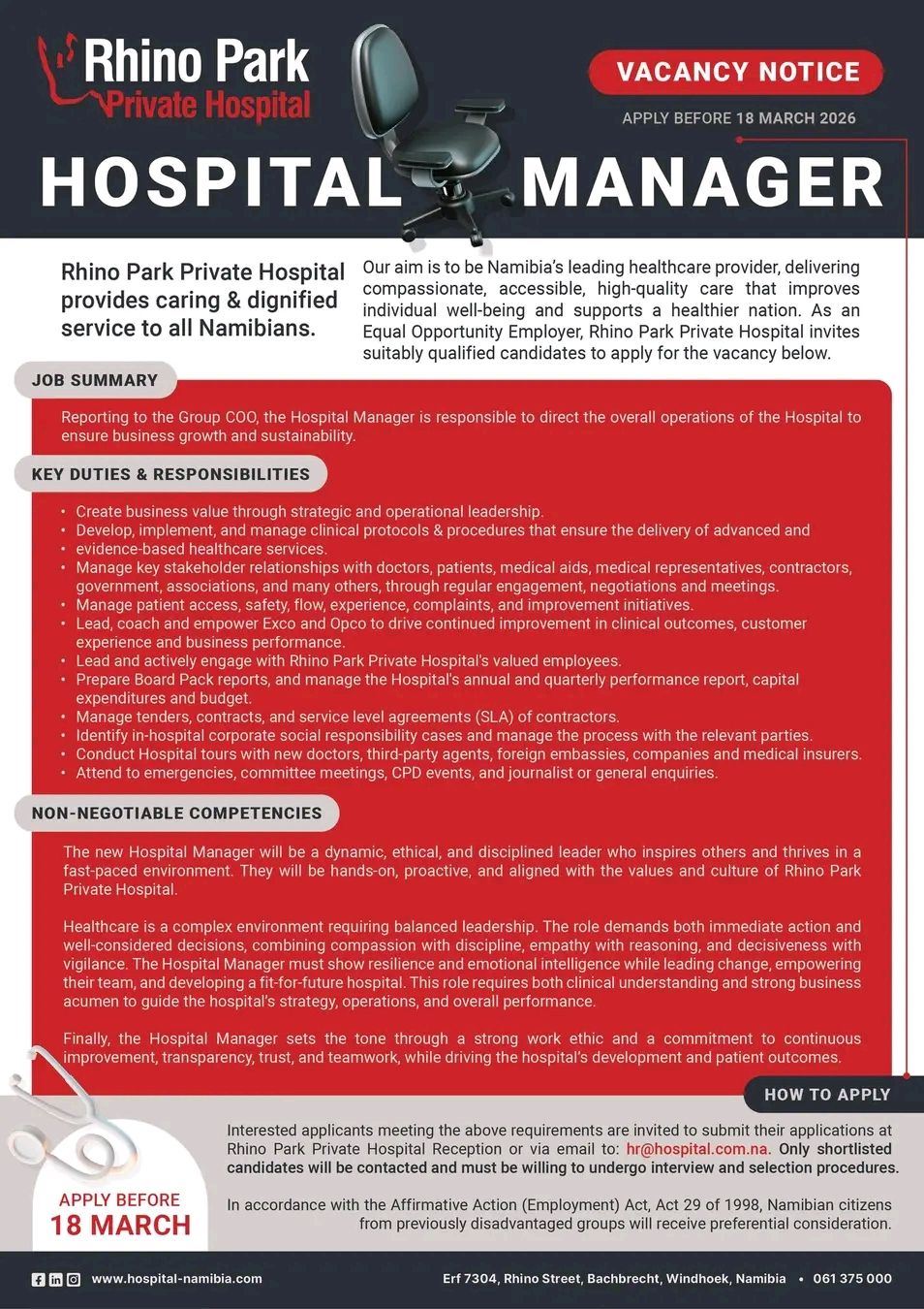 Job seekers are encouraged to explore the Rhino Park Private Hospital Careers Portal by reading our article carefully, as we consistently update the latest job opportunities on our website. This is a fantastic opportunity for job seekers, as the Rhino Park Private Hospital Recruitment Portal has updated its latest Hospital Manager and other job positions. With the help of our article, you can easily apply for the newest jobs on the Rhino Park Private Hospital Recruitment Portal. The table below contains the recruitment details for the Rhino Park Private Hospital vacancies. Candidates are encouraged to visit the official @www.hospital-namibia.com Job Portal to download and review the official announcement documents in PDF format before applying.