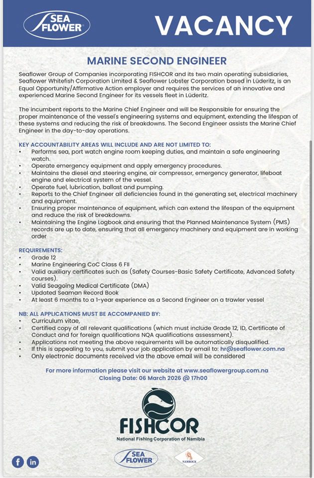 Apply for Marine Second Engineer, Marine Chief Engineer and various job openings in Namibia. Submit your online application for Sea Flower Group job opportunities through the recruitment portal at @www.seaflowergroup.com.na. Our website provides a detailed step-by-step guide on how to apply for Sea Flower Group job openings in Namibia. Stay informed with daily updates on the latest vacancy news and notices in Namibia.