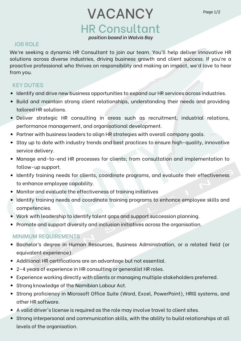 Namibian candidates seeking Seventy7 Consulting job opportunities have come to the right place! This article offers detailed information on HR Consultant, Coordinator, Technician and various other job openings to help advance your career. For those interested in employment with the Namibian government and private companies, we provide up-to-date information on current Seventy7 Consulting job openings. The Seventy7 Consulting Vacancies Portal is known for frequently hiring for various government positions in Namibia, making it one of the most sought-after platforms. Additionally, you can download the Seventy7 Consulting Application Form 2025 PDF for Namibian government jobs directly from our website. Start your career journey today!