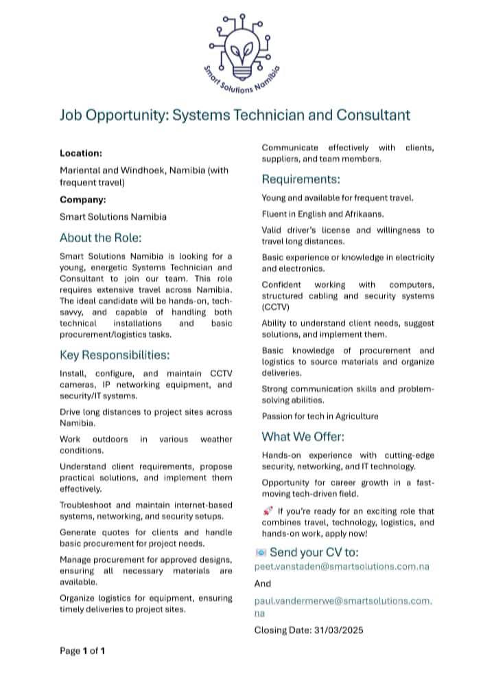 Namibian candidates seeking Smart Solutions Namibia job opportunities have come to the right place! This article offers detailed information on Systems Technician, Consultant and various other job openings to help advance your career. For those interested in employment with the Namibian government and private companies, we provide up-to-date information on current Smart Solutions Namibia job openings. The Smart Solutions Namibia Vacancies Portal is known for frequently hiring for various government positions in Namibia, making it one of the most sought-after platforms. Additionally, you can download the Smart Solutions Namibia Application Form 2025 PDF for Namibian government jobs directly from our website. Start your career journey today!