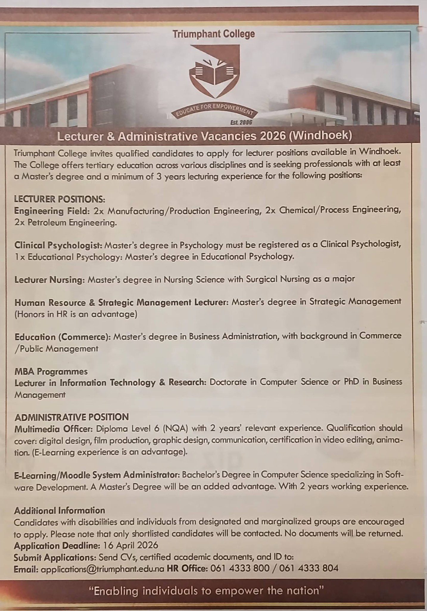 The Triumphant College Career Portal has recently published new job openings across different roles and locations. Candidates can apply for latest job opportunities in Namibia through the official recruitment portal based on their qualifications and experience. You can explore available opportunities through the official careers portal and follow the application steps carefully. This is a great opportunity to explore high paying jobs in Namibia and build a strong professional career with Triumphant College. Job positions are available in Windhoek, Swakopmund, Walvis Bay, Okahandja, Otjiwarongo, Rundu, and other locations across Namibia. You can explore latest job vacancies, salary details, and career opportunities in Namibia all in one place.