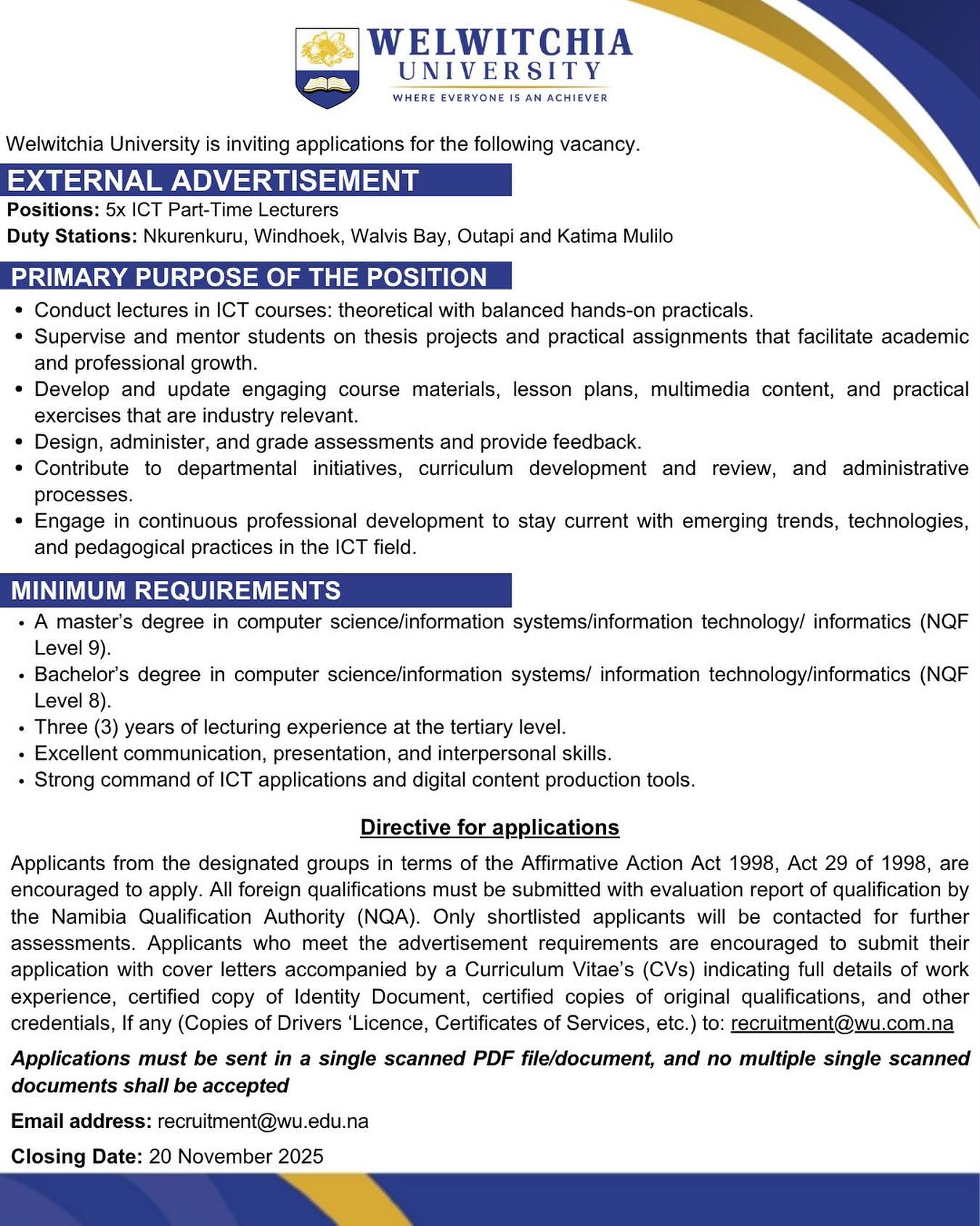 Namibian candidates seeking Welwitchia University job opportunities have come to the right place! This article offers detailed information on Part-time Lecturers, Officer and various other job openings to help advance your career. For those interested in employment with the Namibian government and private companies, we provide up-to-date information on current Welwitchia University job openings. The Welwitchia University Vacancies Portal is known for frequently hiring for various government positions in Namibia, making it one of the most sought-after platforms. Additionally, you can download the Welwitchia University Application Form 2025 PDF for Namibian government jobs directly from our website. Start your career journey today!